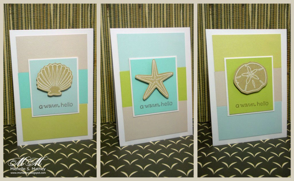 After embossing and cutting out my elements (Sea Shells stamp set), choosing a sentiment from the Life's a Breeze stamp set all that was left was to make a pleasing layout with some pieces of the Seaglass paper.